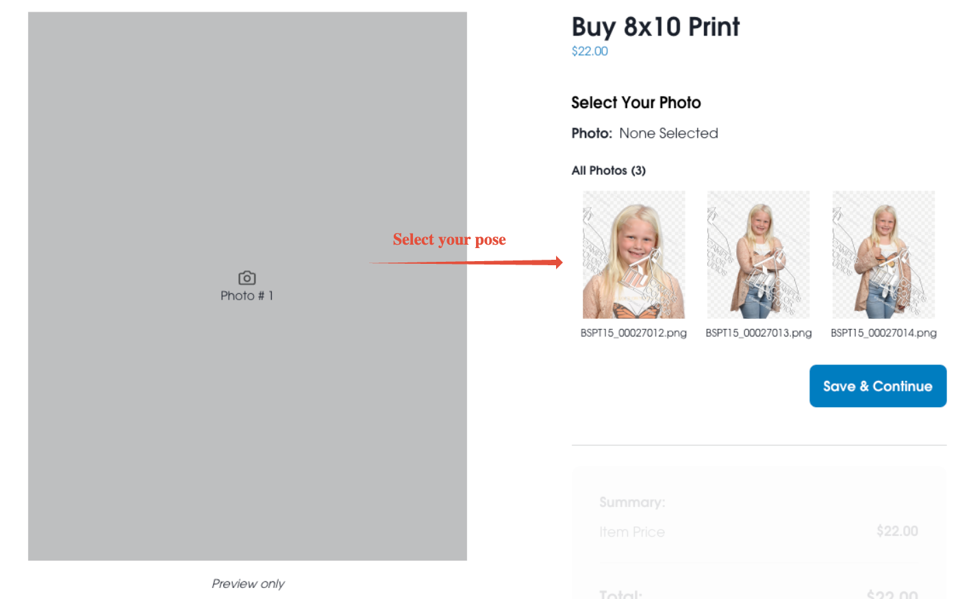 Before you "Save & Continue" it is best to review your Image Selected for the pose and background that you choose. If you had clicked "Buy Photo" under the image in the "My Photos" tab you can change the background by clicking that pose.